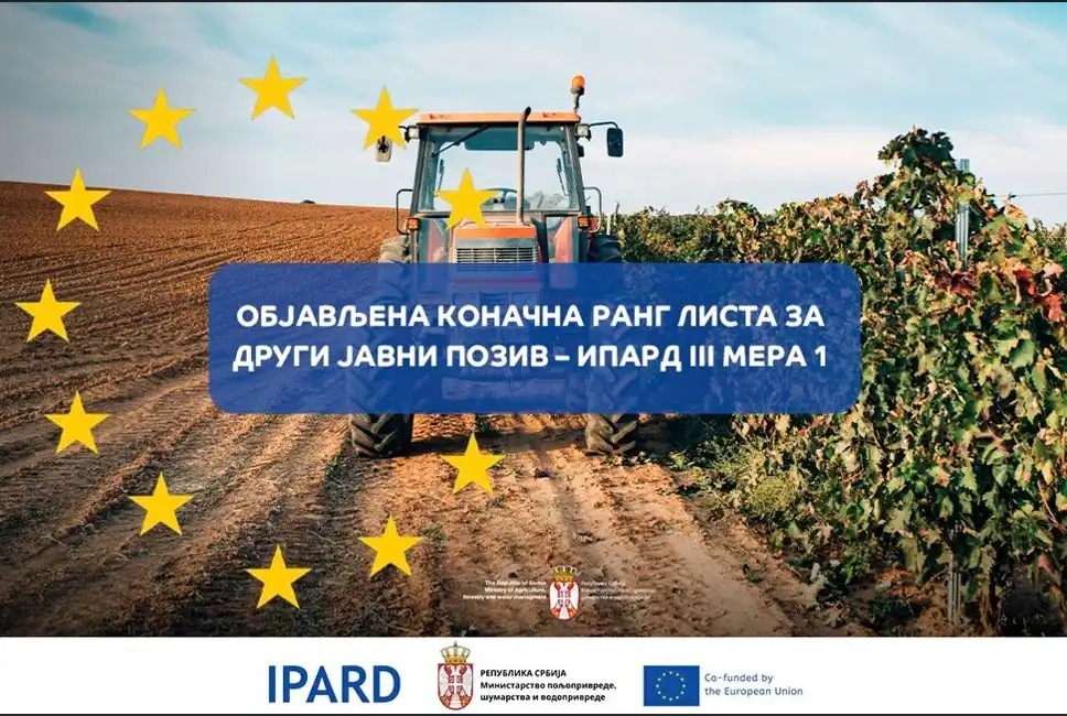Ministarstvo poljoprivrede, šumarstva i vodoprivrede – Uprava za agrarna plaćanja objavilo je Konačnu rang-listu zahteva za odobravanje projekata podnetih po Drugom javnom pozivu za investicije u nabavku novog traktora, u okviru IPARD III programa.